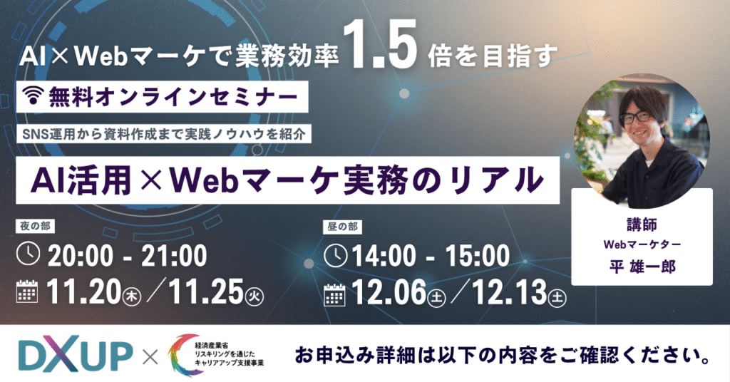 | 内容 | ・Webマーケティングとは? ・AI活用の基本、実践 ※セミナー内容は当日一部変更になる可能性がございます。 |